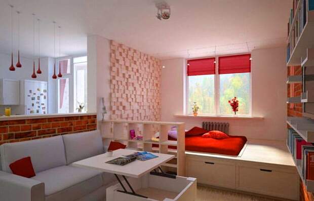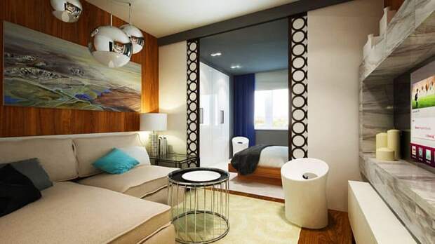 - Существует специальная мебель-трансформер, настоящая палочка-выручалочка для небольших помещений. Необходимо продумать расстановку такой мебели, для того чтобы не составляло проблем использовать ее в разных качествах, при этом не являясь помехой. Стоит отметить, что вариант открытых гостиной и спальни наилучшим образом подходит для человека, живущего в одиночестве, но для семей, состоящих из нескольких человек, предпочтительный вариант – зонирование.