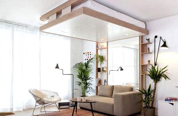 Например, в высокое помещение идеально впишется кровать-чердак или подвесная кровать, которую можно опускать вниз только в ночное время, а в течение дня поднимать наверх.