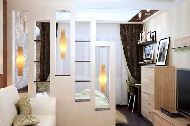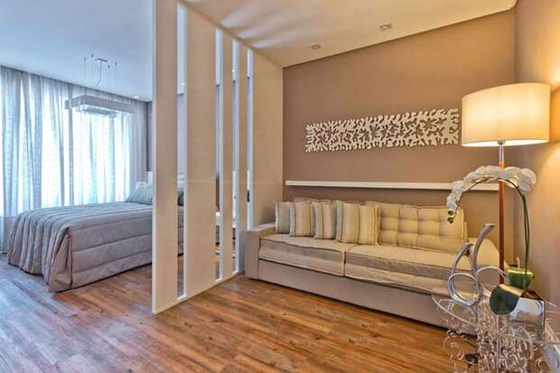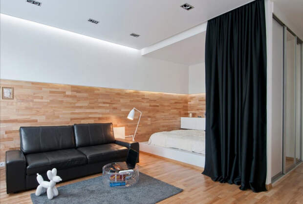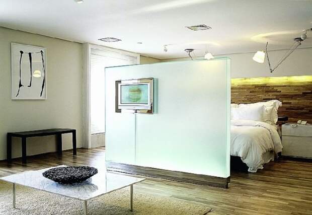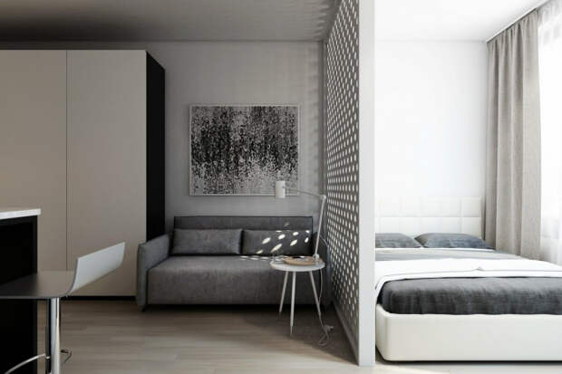 Кроме указанных способов зонирования, при отсутствии видимых преград между спальным местом и гостиной, есть и другие. Например, способ, требующий перегородки между зонами