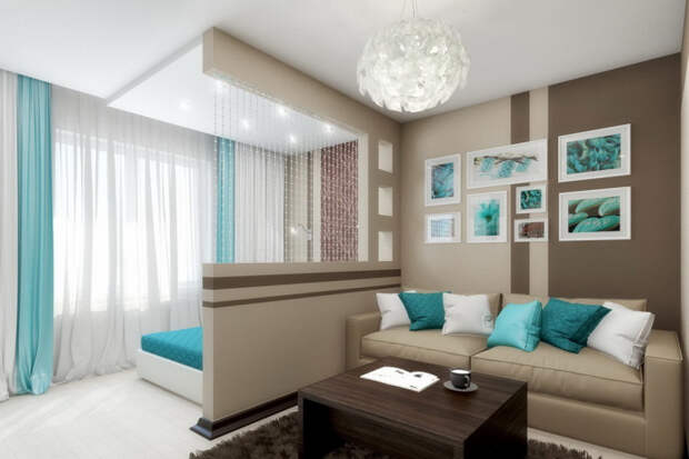 - Для малых комнат, площадью до 14 кв. м., чаще всего используют трансформирующуюся мебель, которая при надобности создает спальное место. Какие-то стационарные перегородки применять нежелательно, так будет ощущаться потеря и без того малой площади.