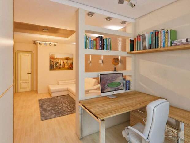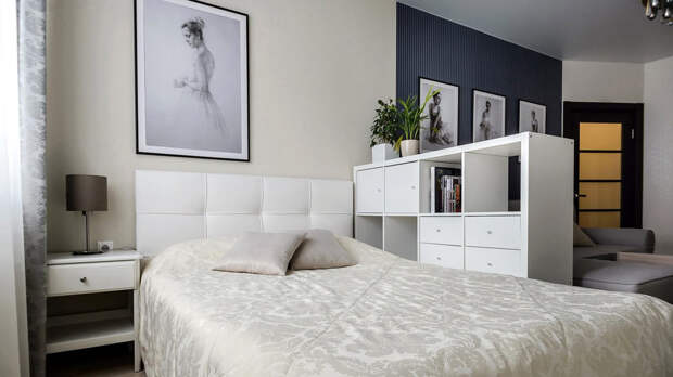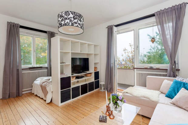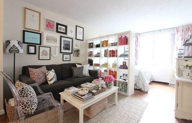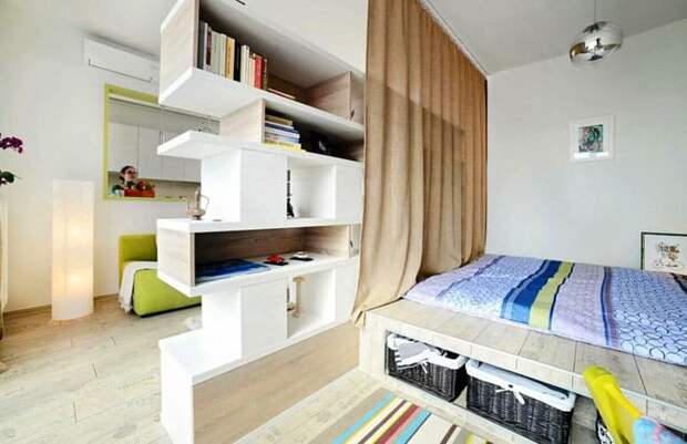 Зонирование в однокомнатной квартире с использованием стеллажа-перегородки