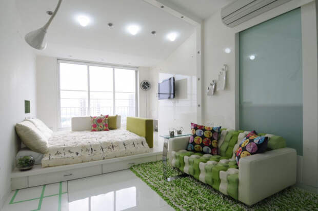 Вертикальное зонирование – отличное решение для квартиры студии. Перед началом отделочных работ строится второй ярус с полноценным спальным местом. На нижнем этаже располагается кухня, ванна и туалет, а также рабочее место. Дорогое, но креативное и шикарное решение – подвесная кровать на пульте управления. Днем она висит под потолком и ночью опускается.