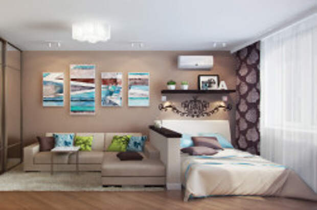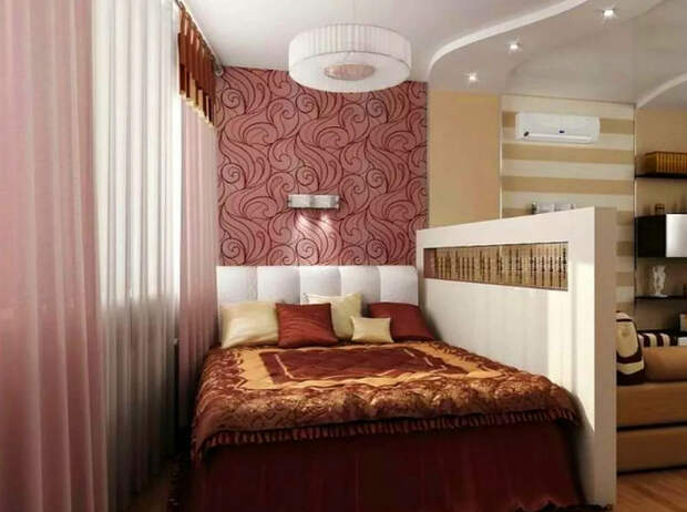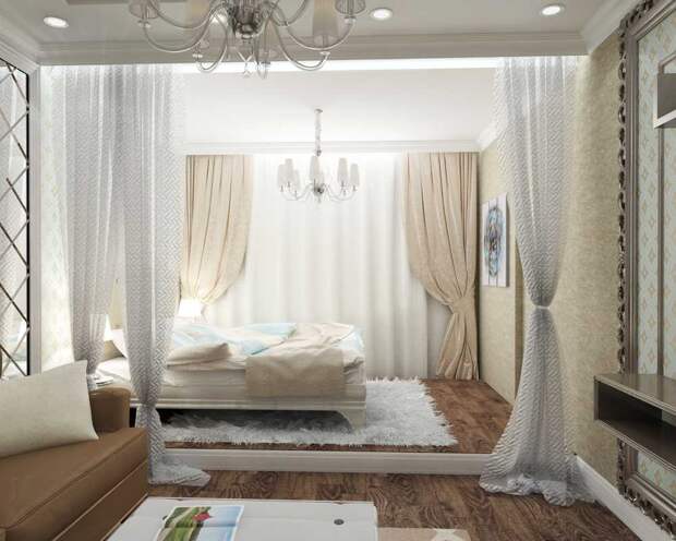 Если нужно максимально эффективно использовать пространство небольшой комнаты, рекомендуется выделить две зоны – спальню и гостиную. Особенно это важно для квартир студий.