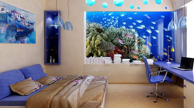 - Если площадь комнаты позволяет, то можно установить стеклянную перегородку или целый аквариум на всю стену. Это дорогое, но оригинальное решение разделения пространства.
