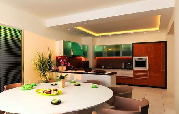 - Одним из оптимальных вариантов, в плане «съедания» полезной площади, выступает двухуровневый потолок. Отлично, если один из уровней будет отличаться не только по высоте, но и по свету и иметь отличительную подсветку.