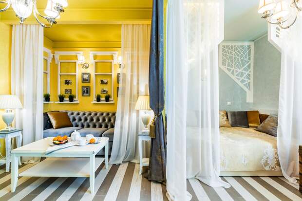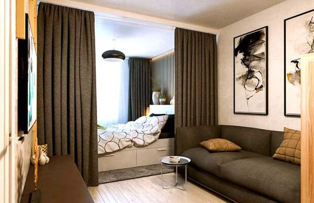 Разделяя одно жилое пространство на гостиную и место для сна, человек получает уголок своего личного пространства, которое так важно иметь каждому.