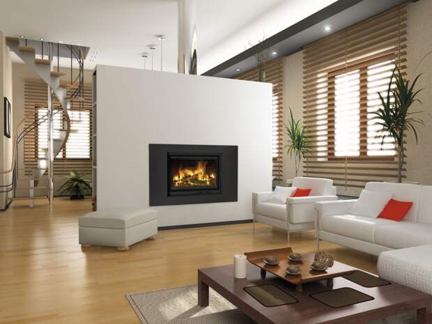 - Не менее интересно будет смотреться камин. Им можно прекрасно поделить комнату на два полнофункциональных сектора. Настоящий камин в квартире не разместить, а вот электрический аналог можно красиво вписать в интерьер.