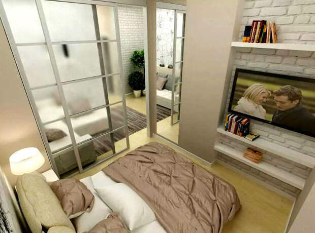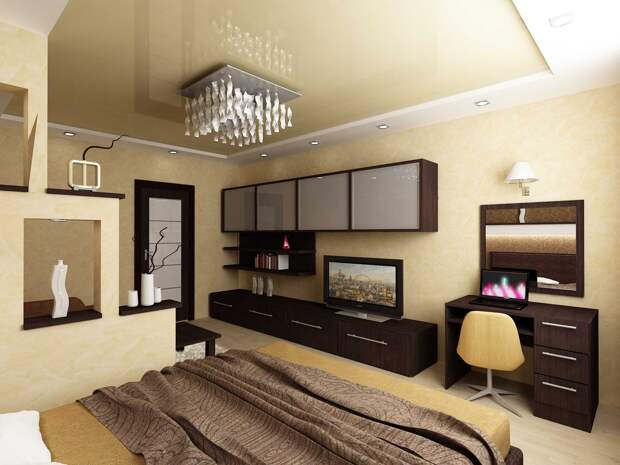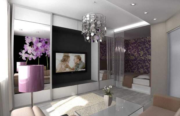 Что касается освещения, то оно должно быть отдельным для спальни и для гостиной. Это могут быть две люстры или точечные светильники, вмонтированные в подвесной потолок. В спальне рекомендуется выделить отдельно зону зеркала (это может быть зеркало на дверце шкафа-купе), а в гостиной — зону отдыха около телевизора. Легче всего это сделать при помощи встроенных светильников с направленным светом, так как настенные бра не рекомендуется монтировать в маленьких помещениях.