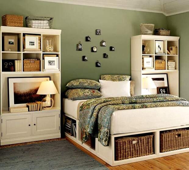 Рекомендуется отдавать предпочтение многофункциональной мебели, имеющей потайные места для хранения, а также рационально задействовать место под потолком.