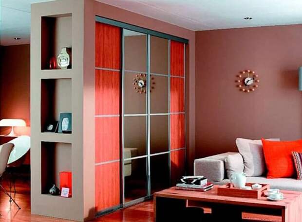 Отделяя спальню от гостиной при помощи шкафа, следует подумать, в какую сторону он будет повернут. Рекомендуется использовать шкафы-купе, так как их дверца сдвигается в сторону, не требуя дополнительного места. К тому же на дверце часто крепится зеркало. Как известно, зеркала в маленьком помещении визуально увеличивают его. В какую бы сторону — спальни или гостиной — ни был повернут шкаф, следует позаботиться об украшении его задней стенки. Это могут быть гравюры, рисунки, драпировка или те же зеркала. Никак не украшенная задняя стенка шкафа способна испортить дизайн.