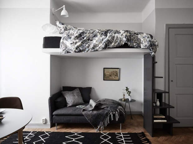 Скандинавский стиль с белым нейтральным фоном, добротными деревянными мебельными предметами, натуральным текстилем и сдержанным декором, придаст дизайну комнаты, поделенной на спальню и гостиную дополнительного простора и воздуха. Для данной стилистики характерны элементы зонирования, отличающиеся компактностью и функциональностью.