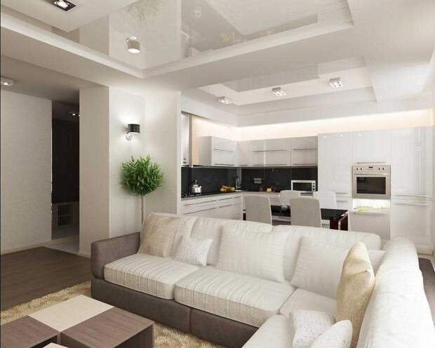 Минимализм станет идеальным стилевым решением для помещения в котором предполагается объединение двух сегментов и требуется сохранение порядка. Интерьер комнаты выполняется в ограниченной цветовой гамме и обставляется трансформирующейся мебелью с четкими геометрическими формами.